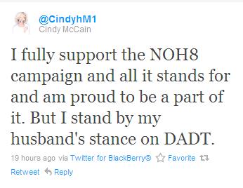 Just as we were about to describe Cindy McCain’s engagement of her whole self at work as she took a clear stand against “Don’t Ask, Don’t Tell”–a policy her husband John McCain supports–see video above, she logged into her Twitter and reclaimed her privilege as a U.S. Senator’s wife. She tweeted, “I fully support the NOH8 campaign and all it stands for and am proud to be a part of it. But I stand by my husband’s stance on DADT.”